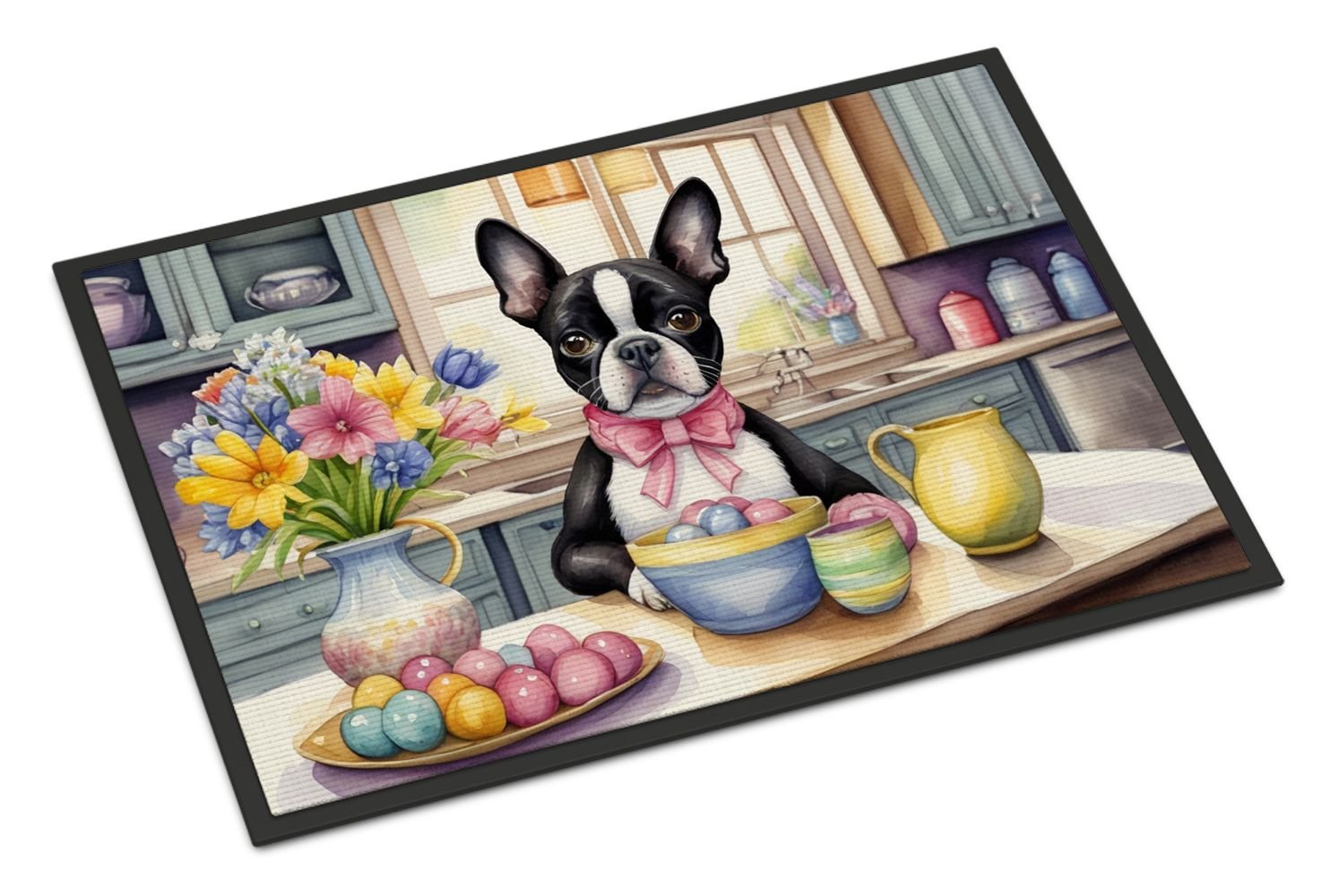 Doormat featuring breed specific Boston Terrier artwork. Celebrate Easter with this Easter Doormat. Welcome your guests in style with our Artwork Door Mat, designed to withstand almost any weather condition. This mat, measuring approximately 18 by 27 inches, is held together by durable black binding tape. Its top layer, composed of polyester felt, is dyed with the eye-catching image you see on the mat. A few layers below provide the mat with stability, while its rubber bottom is stamped to help prevent slipping and ensures safety. Our mat works wonderfully as both an indoor or outdoor door mat. For cleaning, simply hose it off with water or use a power washer - no need for any cleaner that produces suds. Avoid scrubbing with a brush, instead, opt for the vacuum on floor setting. Designed manufactured and printed in the USA, this mat is a perfect addition to your porch, outdoor kitchen, entryway, or any indoor space. Its unique design makes it a charming decorative rug that greets your guests and adds a stylish touch to your home decor.