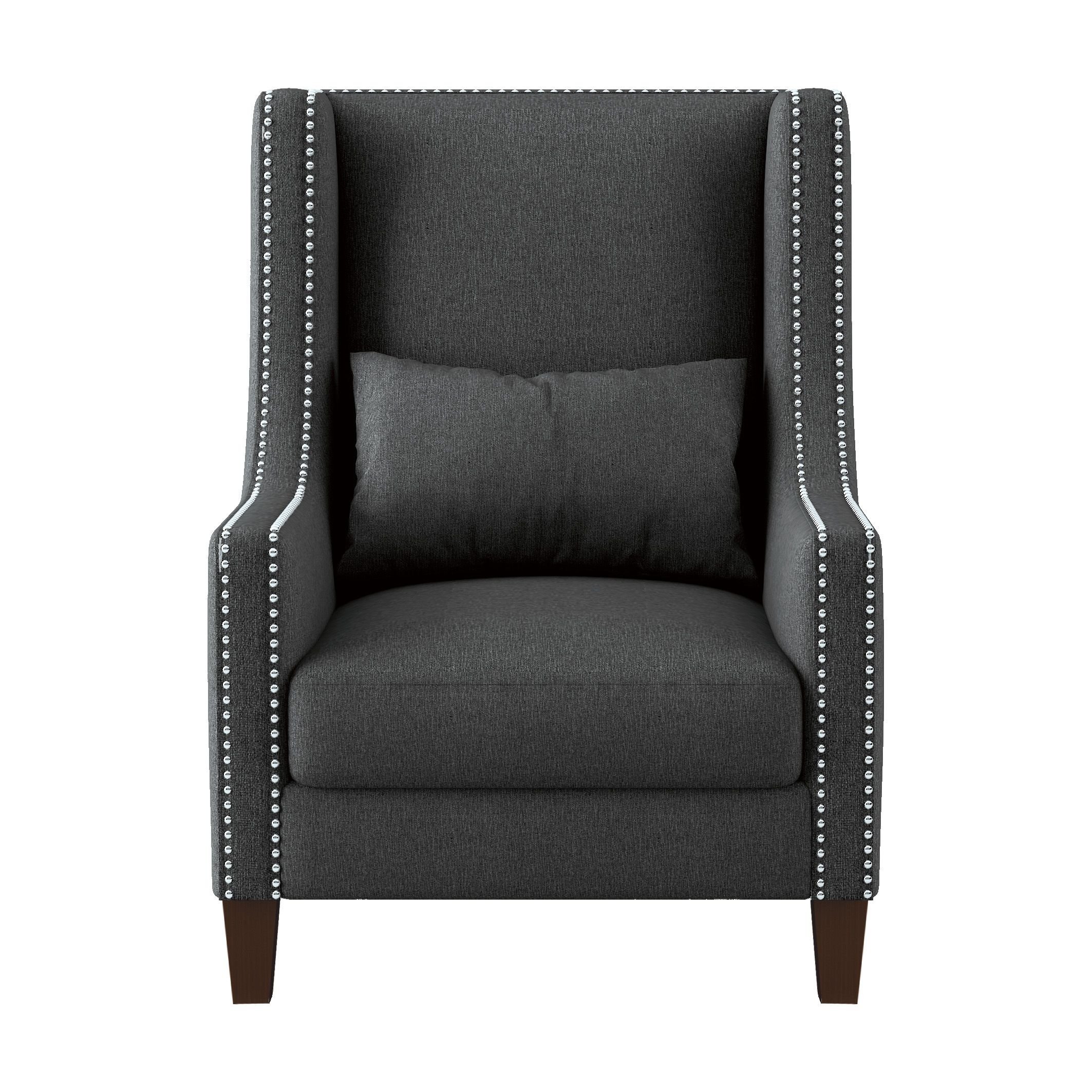 Modern-traditional styling is perfectly executed in the design of the Keller Collection. The high-back profile of this elegant accent chair is defined by nailhead trim and its seating is enhanced by the back-supporting kidney pillow. This accent chair is offered in dark gray for versatile placement within your decorative scheme. Also available in light gray.PRODUCT DIMENSIONS: Overall Dimension: 29" x 32.75" x 38.25"HSeat Width: 20.25"Seat Depth: 22.5"Seat Height: 19.75"Arm height: 23"Pillow dimension: 19.5"x 12" (1)Listing Includes: One Accent Chair Only.Simple Assembly Require.
