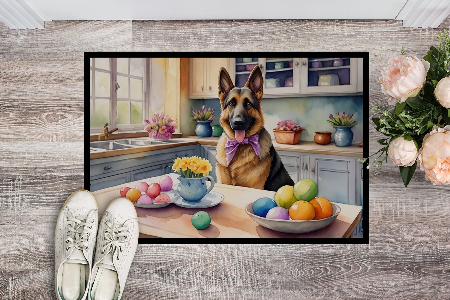 Doormat featuring breed specific German Shepherd artwork. Celebrate Easter with this Easter Doormat. Welcome your guests in style with our Artwork Door Mat, designed to withstand almost any weather condition. This mat, measuring approximately 18 by 27 inches, is held together by durable black binding tape. Its top layer, composed of polyester felt, is dyed with the eye-catching image you see on the mat. A few layers below provide the mat with stability, while its rubber bottom is stamped to help prevent slipping and ensures safety. Our mat works wonderfully as both an indoor or outdoor door mat. For cleaning, simply hose it off with water or use a power washer - no need for any cleaner that produces suds. Avoid scrubbing with a brush, instead, opt for the vacuum on floor setting. Designed manufactured and printed in the USA, this mat is a perfect addition to your porch, outdoor kitchen, entryway, or any indoor space. Its unique design makes it a charming decorative rug that greets your guests and adds a stylish touch to your home decor.