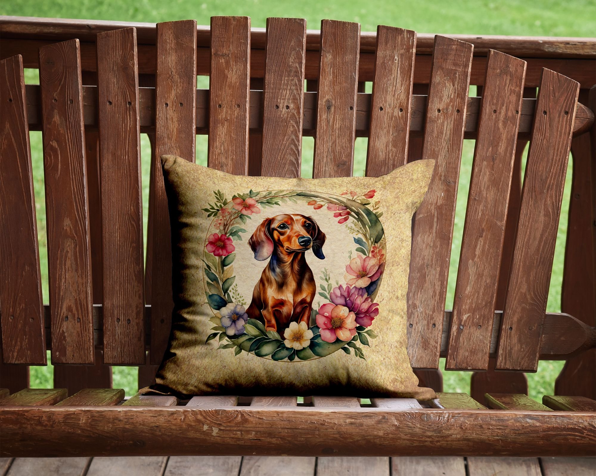 Dachshund and Flowers Throw Pillow Machine Washable, Indoor Outdoor Decorative Pillow for Couch, Bed or Patio, 14Hx14W