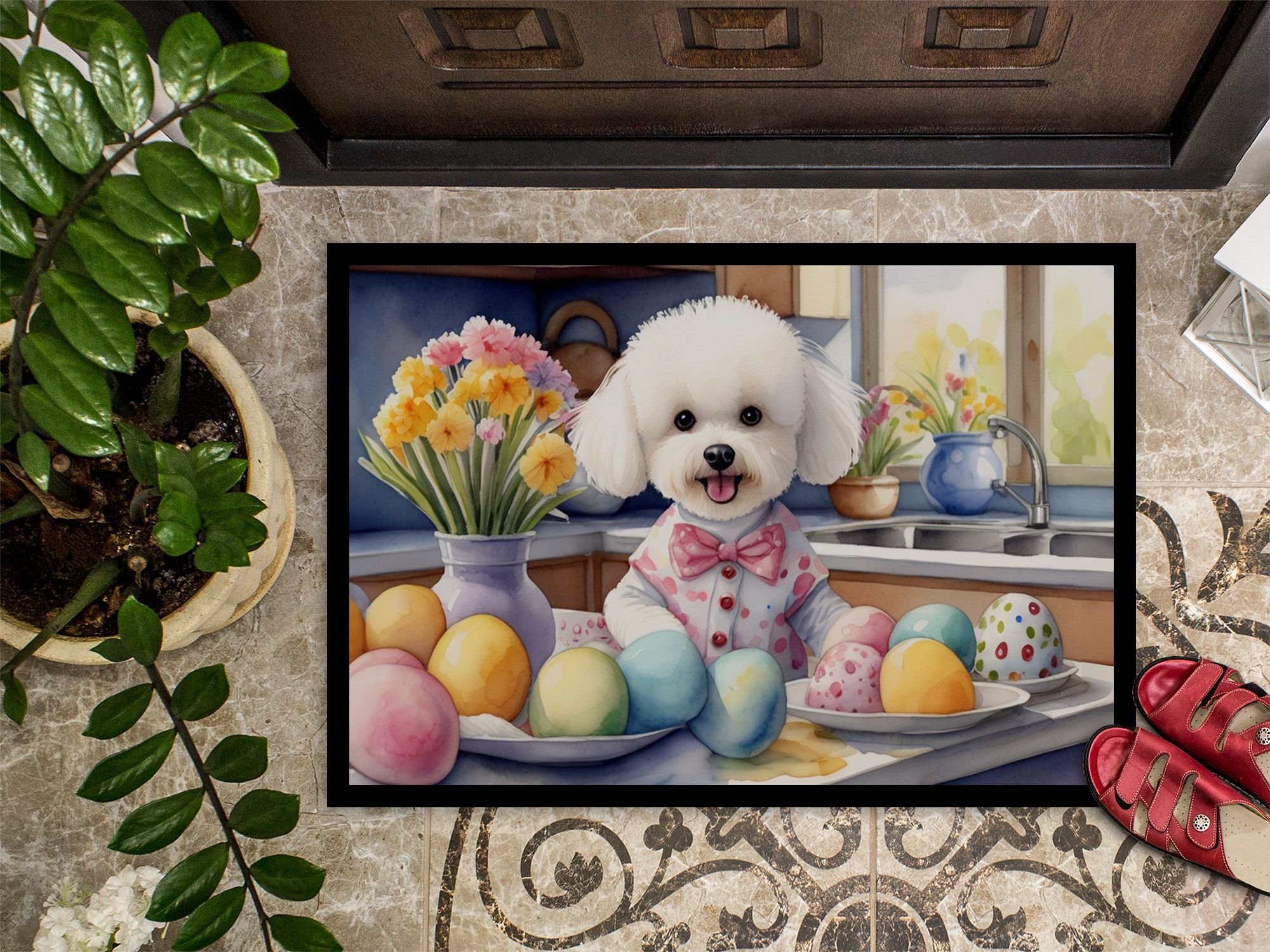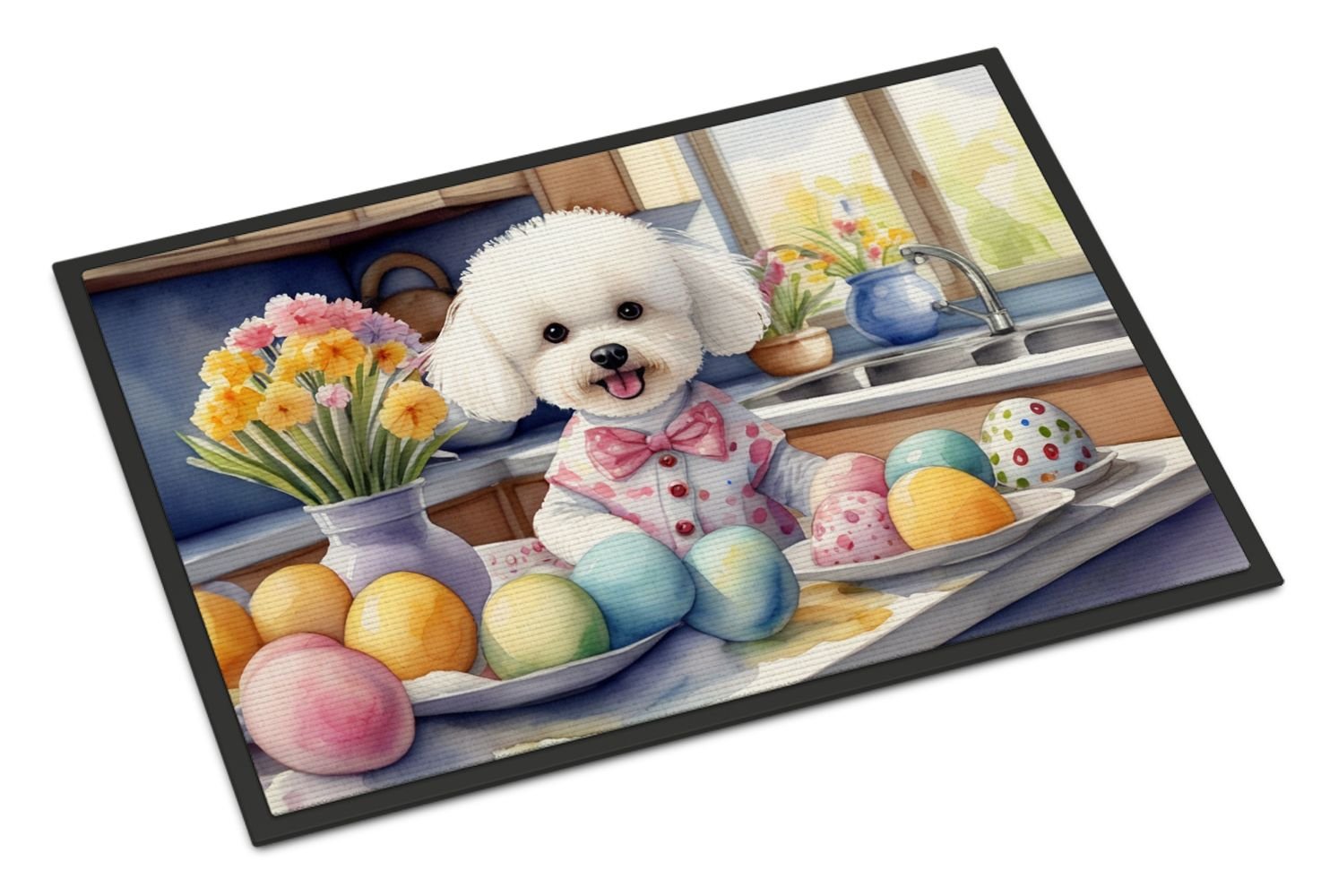 Doormat featuring breed specific Bichon Frise artwork. Celebrate Easter with this Easter Doormat. Welcome your guests in style with our Artwork Door Mat, designed to withstand almost any weather condition. This mat, measuring approximately 18 by 27 inches, is held together by durable black binding tape. Its top layer, composed of polyester felt, is dyed with the eye-catching image you see on the mat. A few layers below provide the mat with stability, while its rubber bottom is stamped to help prevent slipping and ensures safety. Our mat works wonderfully as both an indoor or outdoor door mat. For cleaning, simply hose it off with water or use a power washer - no need for any cleaner that produces suds. Avoid scrubbing with a brush, instead, opt for the vacuum on floor setting. Designed manufactured and printed in the USA, this mat is a perfect addition to your porch, outdoor kitchen, entryway, or any indoor space. Its unique design makes it a charming decorative rug that greets your guests and adds a stylish touch to your home decor.