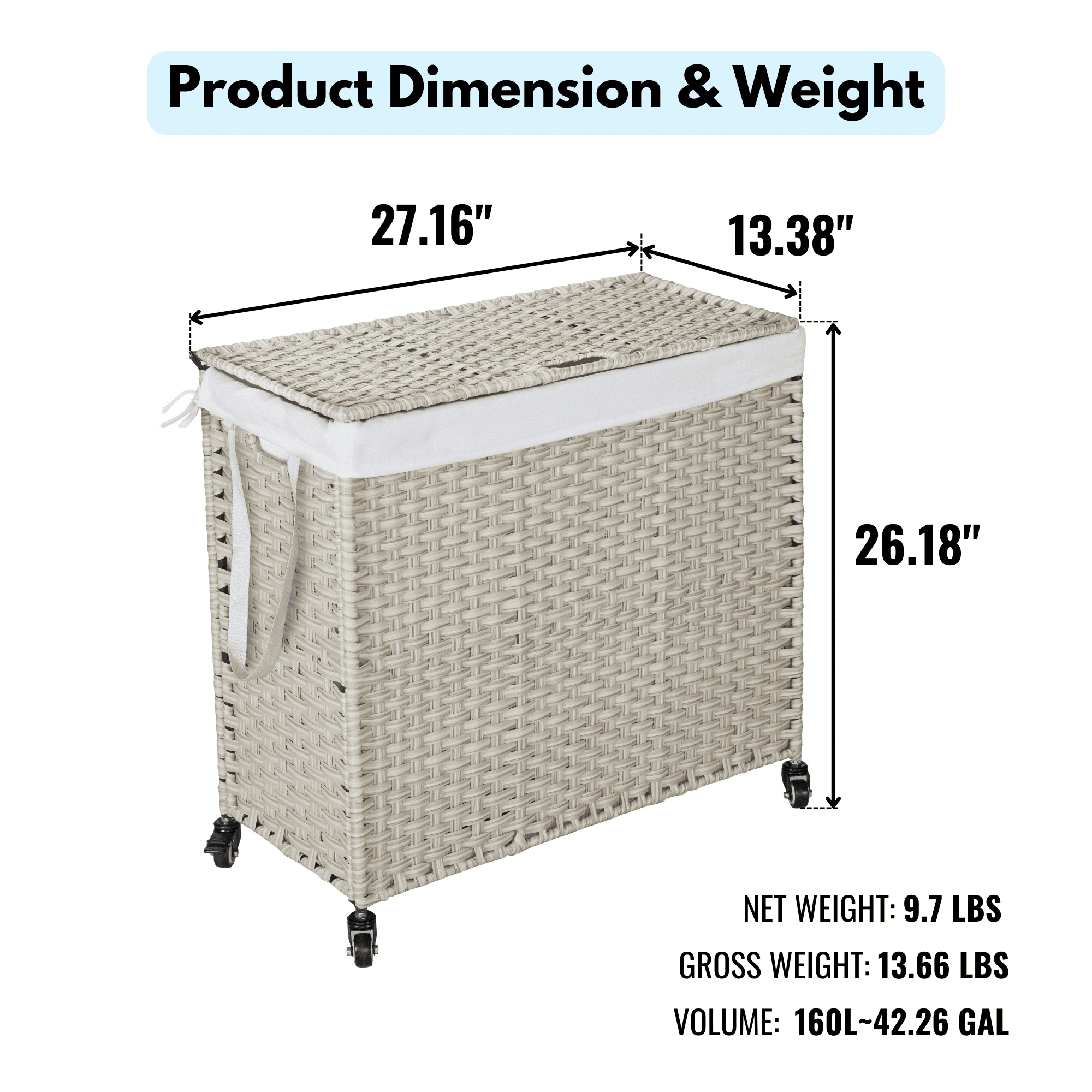 WHAT WILL YOU GET? - A laundry basket set includes - 01 laundry basket with lid 27 inch length x 13.38 inch width x 26.18 inch height with loading capacity at 160 L ~ 42.26 ; 02 laundry bags with one compartment and two compartments; a set of 04 wheels; clear installation instructions.
