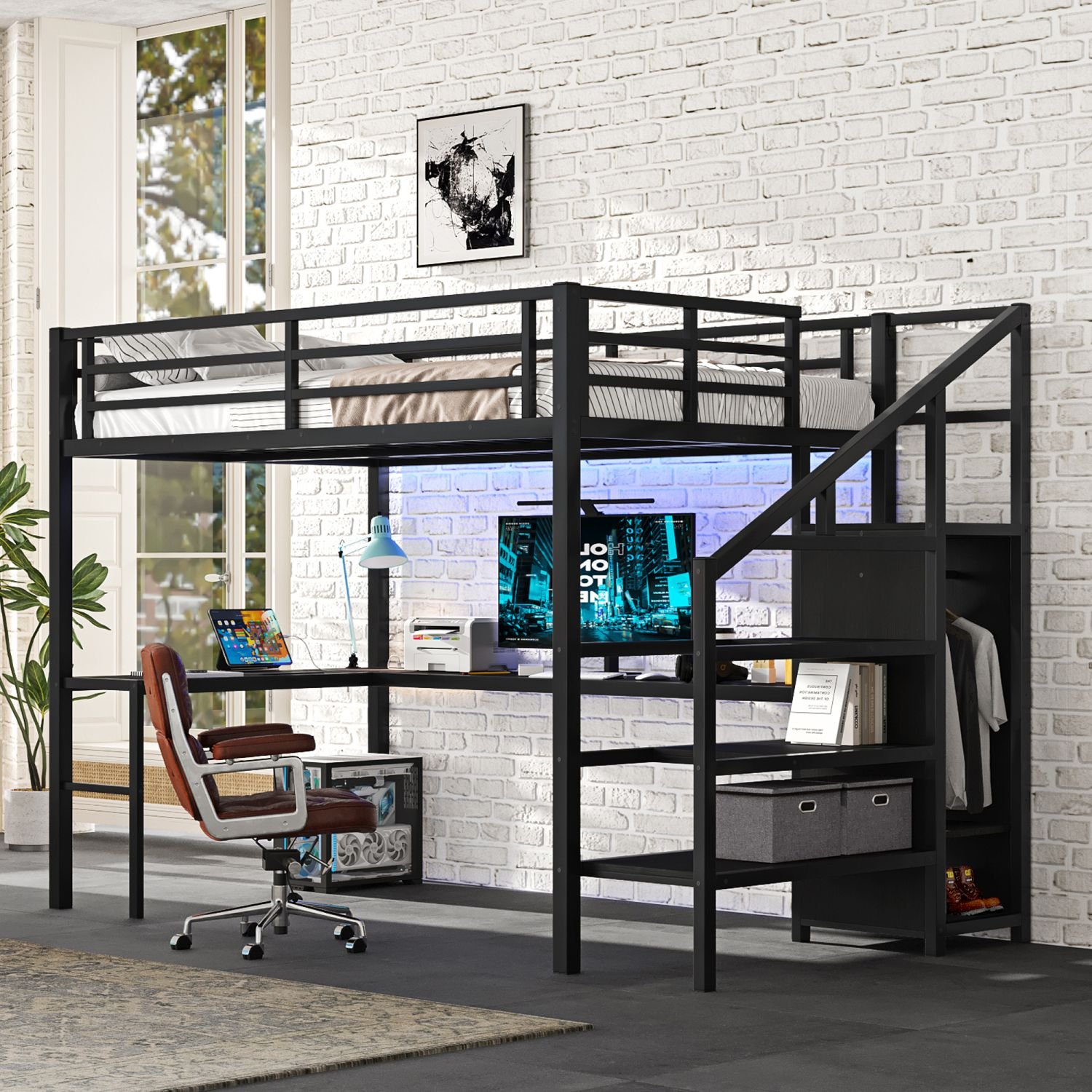 DescriptionIf you need a versatile bed, then our metal loft beds are the perfect choice. The full-size upper bed provides you with plenty of sleeping space, and the desk below is the perfect area to work and study. In addition, the full size loft bed comes with a built-in closet that can be used for storing your daily clothes and supplies, and the interchangeable left and right staircases allow for storage while keeping it sturdy. The USB and LED lights are designed to provide you with great convenience. Quality metal materials and a minimalist black design make this loft bed an eye-catcher in the bedroom.