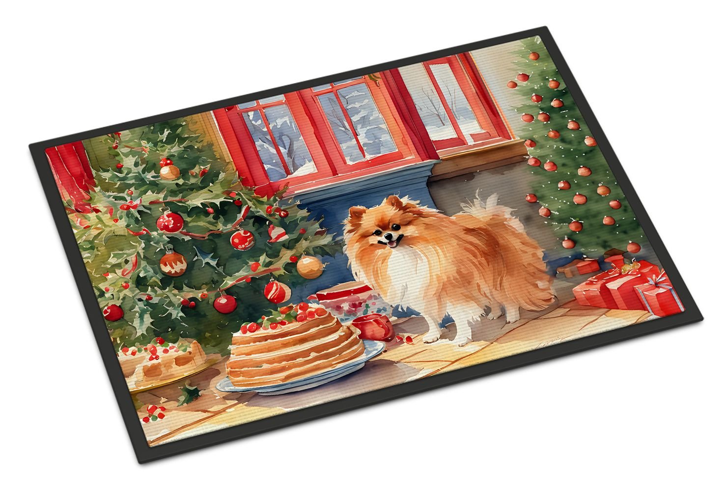 Doormat featuring breed specific Pomeranian artwork. Celebrate Christmas with this Christmas Doormat. Welcome your guests in style with our Artwork Door Mat, designed to withstand almost any weather condition. This mat, measuring approximately 24 by 36 inches, is held together by durable black binding tape. Its top layer, composed of polyester felt, is dyed with the eye-catching image you see on the mat. A few layers below provide the mat with stability, while its rubber bottom is stamped to help prevent slipping and ensures safety. Our mat works wonderfully as both an indoor or outdoor door mat. For cleaning, simply hose it off with water or use a power washer - no need for any cleaner that produces suds. Avoid scrubbing with a brush, instead, opt for the vacuum on floor setting. Designed manufactured and printed in the USA, this mat is a perfect addition to your porch, outdoor kitchen, entryway, or any indoor space. Its unique design makes it a charming decorative rug that greets your guests and adds a stylish touch to your home decor.