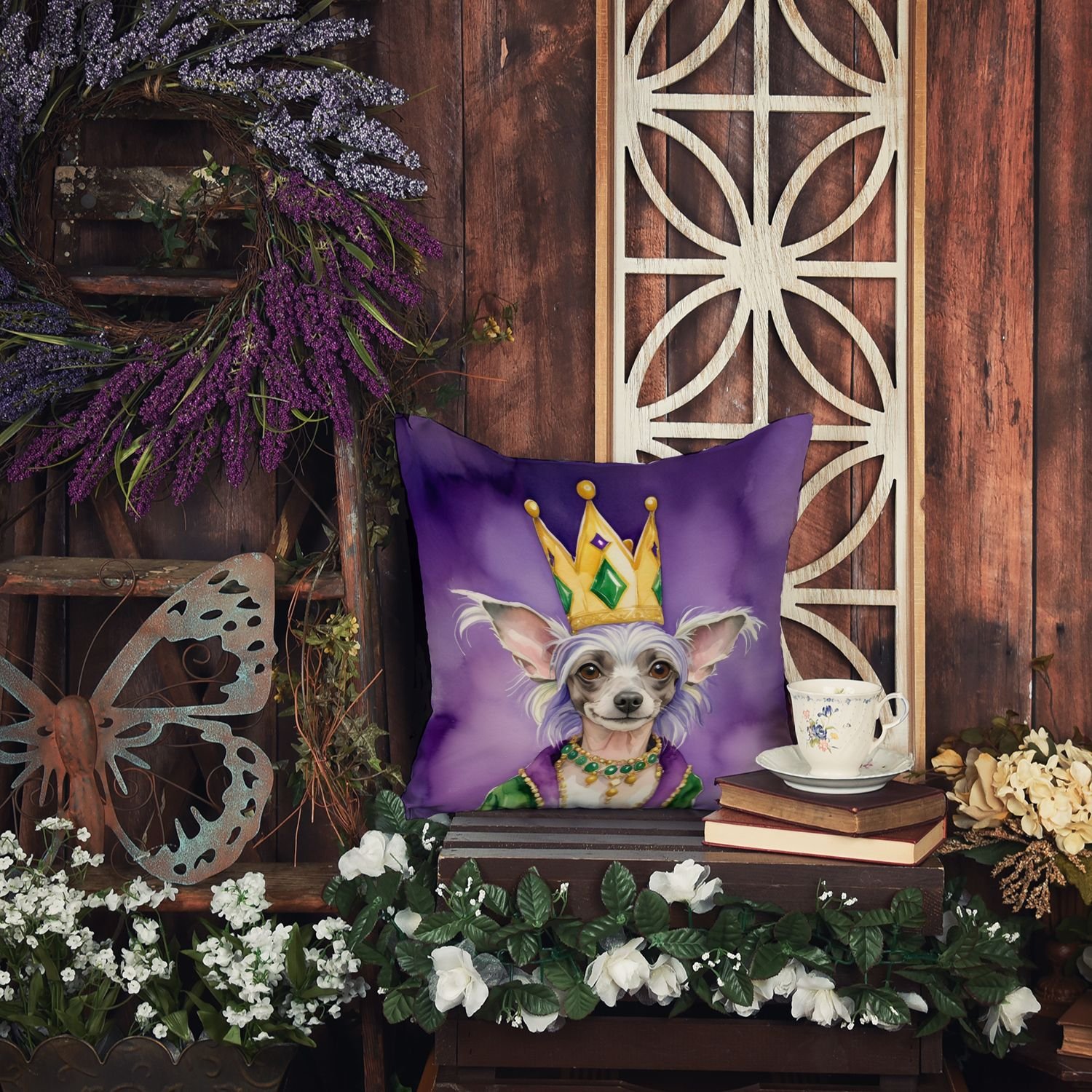 Throw Pillow featuring breed specific Chinese Crested artwork. Celebrate Mardi Gras with this Mardi Gras Pillow. Revitalize your outdoor or indoor living space with Caroline's Treasures 18x18 Fabric Decorative Pillow. With a generously sized dimension of approximately 18 inches by 18 inches, this pillow makes a comfortable and aesthetic addition to any seating area. Made from a unique, water-resistant material developed by Caroline's Treasures, the pillow sham is 100% polyester fabric that's durable and ready to weather any condition. Its vibrant, full-color artwork will not fade over time as it is dyed with color-fast dyes. Whether you place it on your patio furniture, porch, veranda, or indoor couch, its soft canvas fabric ensures a cozy experience. The pillow is handcrafted in the United States, featuring a sham created from three pieces of fabric and a polyester insert for enduring shape and overstuffed comfort. Despite being robustly built to endure the outdoors, it is as soft and snug as your favorite indoor cushions. Please note, as all our pillows are handmade, sizes may vary slightly, adding to the charm of this unique decorative item.