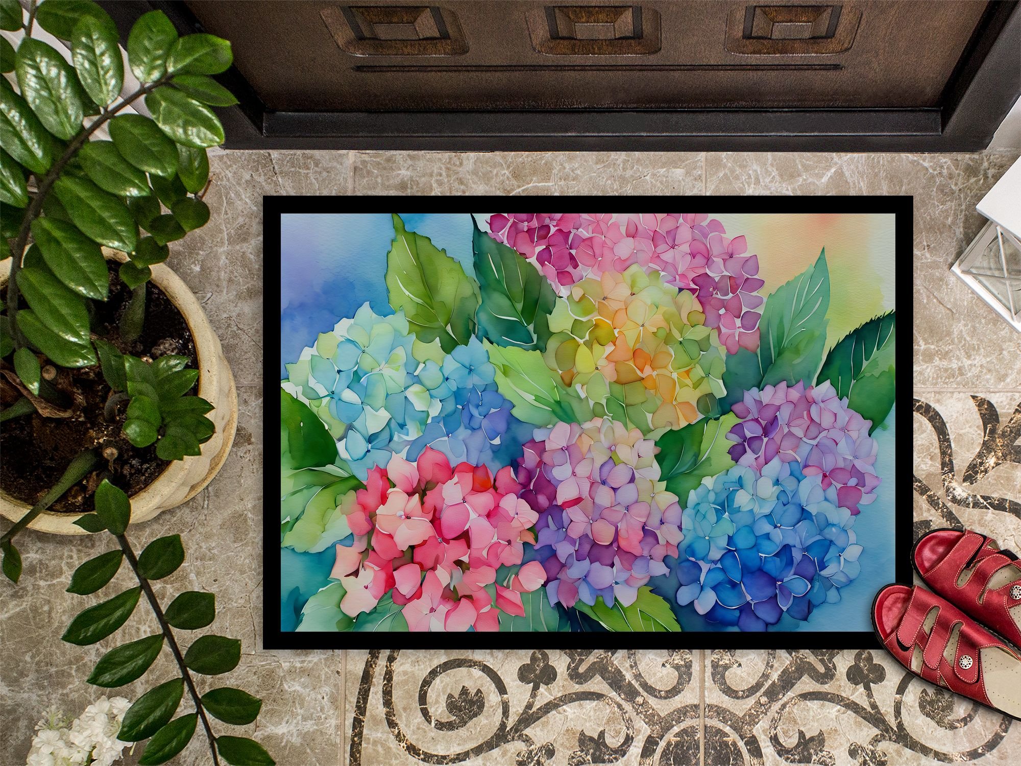Home > Hydrangeas in Watercolor Doormat Front Door Mat Indoor Outdoor Rugs for Entryway, Non Slip Washable Low Pile, 24H X 36W